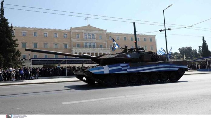Στην παρέλαση έκαναν «πρεμιέρα» τα άρματα μάχης Marderαλλά και τα μαχητικά αεροσκάφη Rafale και τα F-16 Vipe.