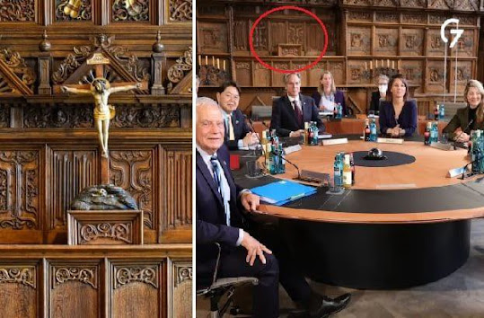 Ο μεγάλος σταυρός που ήταν τοποθετημένος σε τοίχο με ξύλινη επένδυση, είναι ο «Σταυρός του Συμβουλίου» του 16ου αιώνα. Στις φωτογραφίες της ομάδας G7 από το δωμάτιο, ωστόσο, μπορείτε να δείτε στο βάθος ότι η βάση είναι άδεια και ο σταυρός λείπει.