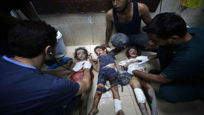 Οι γιατροί περιθάλπουν τρία τραυματισμένα παλαιστίνια παιδιά στο νοσοκομείο Al-Aqsa μετά από ισραηλινή αεροπορική επίθεση, στο Deir el-Balah στην κεντρική Λωρίδα της Γάζας στις 24 Οκτωβρίου.