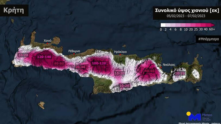Χιονοπτώσεις θα σημειωθούν από σήμερα Κυριακή (05/02/2023) από το απόγευμα σε ορεινές και ημιορεινές περιοχές της Κρήτης όπου θα είναι κατά περιόδους πυκνές. Θα διατηρηθούν οι χιονοπτώσεις έως την Τρίτη, με μικρότερη όμως ένταση.