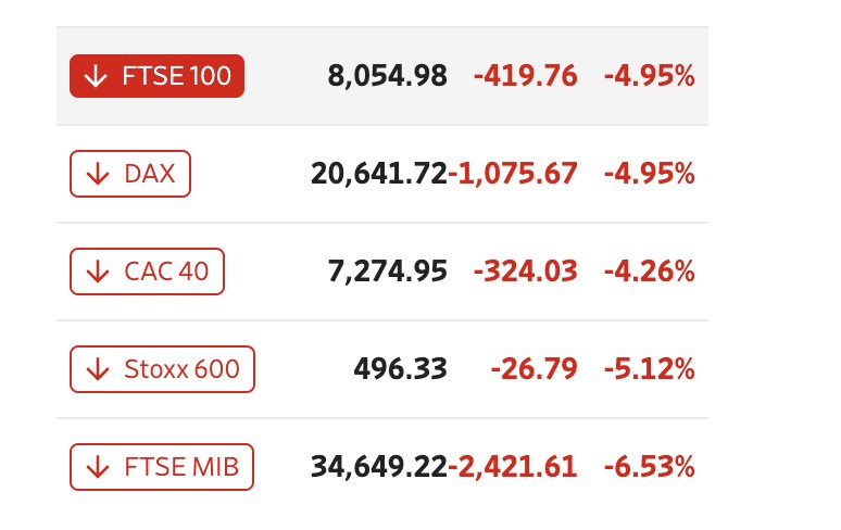 Στο Λονδίνο ο FTSE 100 σημείωσε πτώση 4,95% όσο και ο Dax στη Φρανκφούρτη.