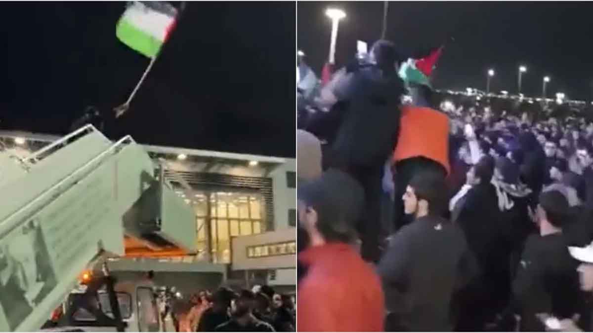 Πολλοί από τους διαδηλωτές που κρατούσαν σημαίες της Παλαιστίνης, προτού να διεισδύσουν στον τερματικό σταθμό ζητώντας να μην επιτραπεί η είσοδος στους Ισραηλινούς.