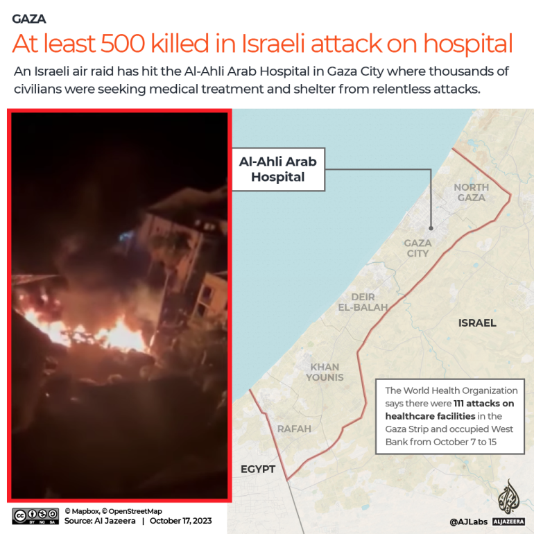 Το υπουργείο Υγείας της Γάζας αναφέρει ότι τουλάχιστον 500 σκοτώθηκαν σε επίθεση στο νοσοκομείο Al-Ahli Baptist, πολλοί από τους οποίους γυναίκες και παιδιά. Χτυπήθηκε επίσης ένα σχολείο του ΟΗΕ που φιλοξενεί πρόσφυγες.