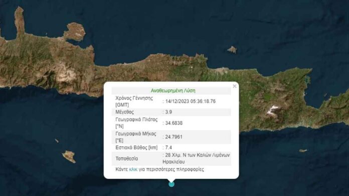 Το εστιακό βάθος υπολογίζεται στα 7,4 χλμ. Σεισμός 3,9 βαθμών της κλίμακας Ρίχτερ σημειώθηκε πριν από λίγα λεπτά στη θαλάσσια περιοχή νότια της Κρήτης.