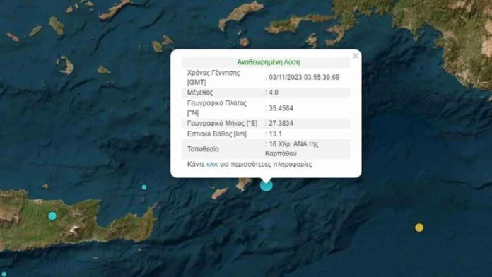 Σεισμός 4,0 βαθμών της κλίμακας Ρίχτερ, που χαρακτηρίζεται «ασθενής», καταγράφτηκε στις 05:55 στον θαλάσσιο χώρο 29 χιλιόμετρα νοτιοανατολικό της Καρπάθου, σύμφωνα με δεδομένα του Γεωδυναμικού Ινστιτούτου του Εθνικού Αστεροσκοπείου της Αθήνας.