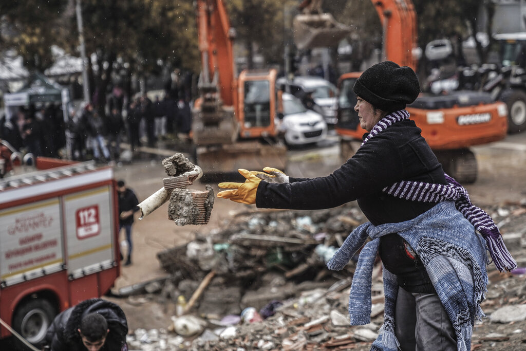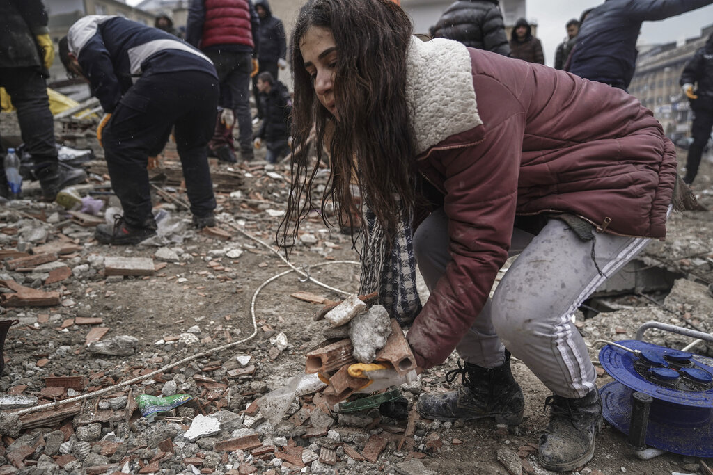 A young women removes debris from a destroyed building as she searches for people with emergency teams in Gaziantep, Turkey, Monday, Feb. 6, 2023. A powerful quake has knocked down multiple buildings in southeast Turkey and Syria and many casualties are feared. (AP Photo/Mustafa Karali)