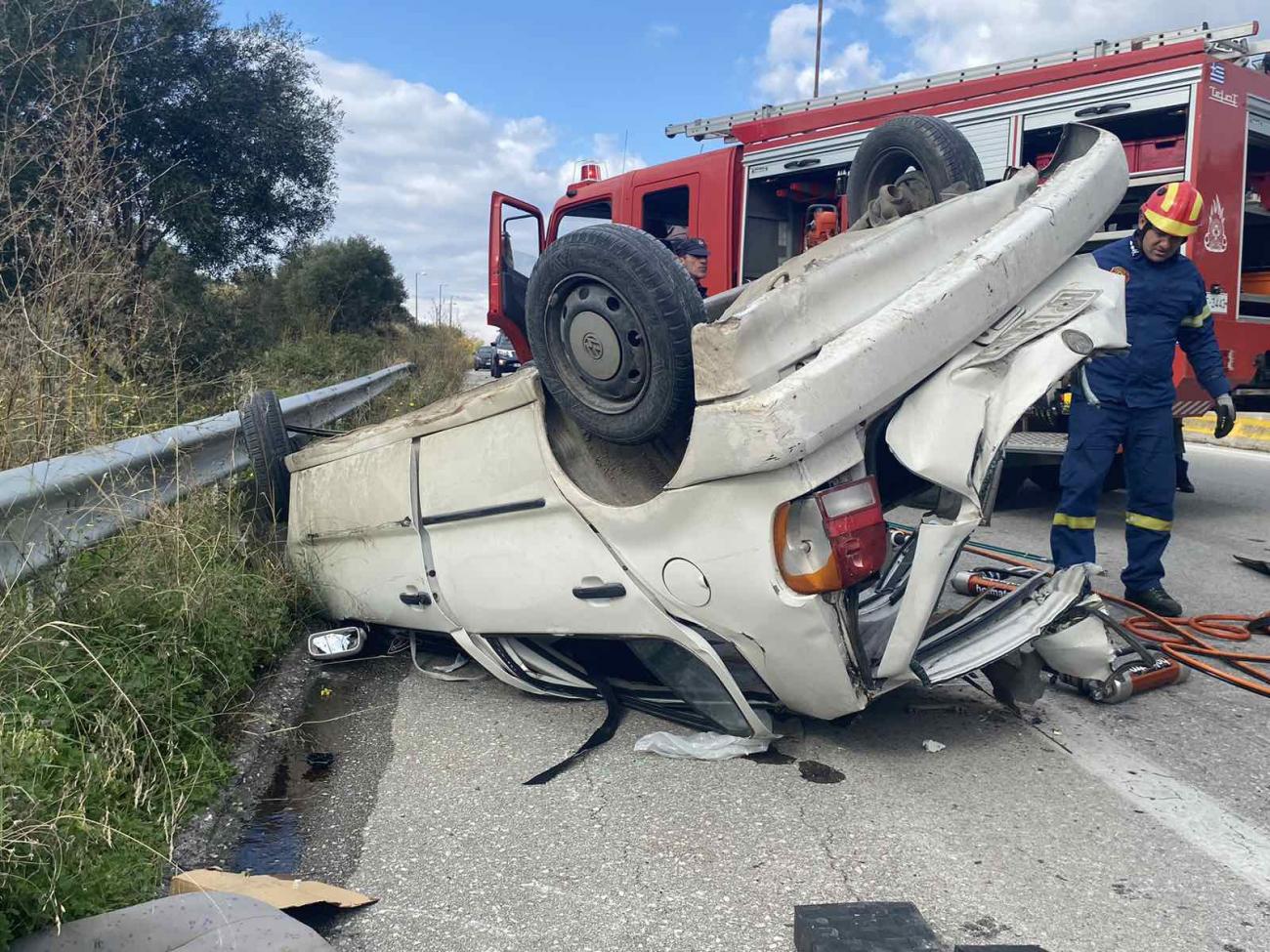 Αυτό είχε ως συνέπεια η γυναίκα να εγκλωβιστεί στα συντρίμμια του οχήματος της ενώ ένας άντρας που επέβαινε στο αυτοκίνητο κατάφερε να βγει μόνος του πριν την άφιξη της Πυροσβεστικής.
